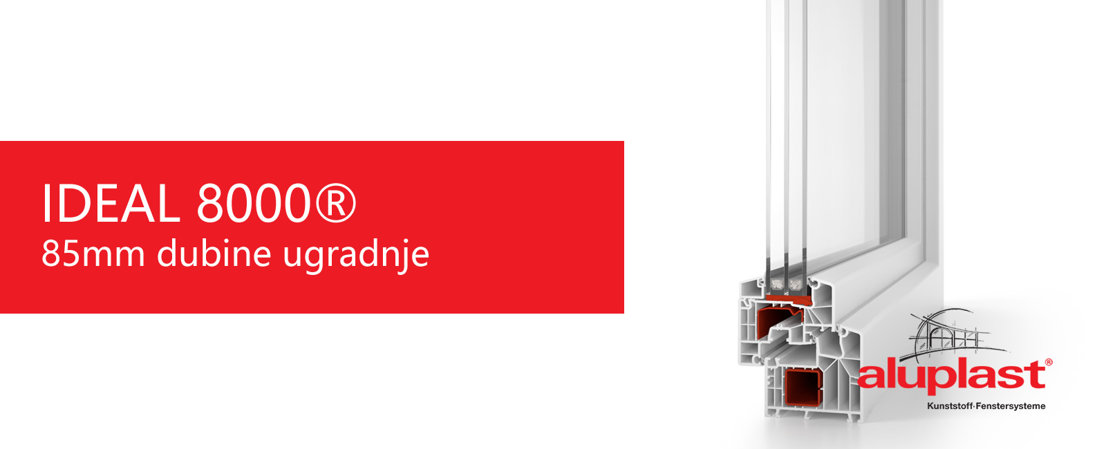 IDEAL 8000® jednostavno je više svijetlosti, sigurnosti i toplinske izolacije. Uži optički izgled profila omogućuje veći prolazak svijetlosti u prostoriju. Profili ojačanja u komorama PVC profila osiguravaju stabilnost kod elemenata velikih dimenzija. Povećana je i protuprovalna zaštita u zoni nalijeganja stakla u krilu. Upravo stapanje prozorskog krila i okvira prozora čine tehnologiju lijepljenja stakla u krilu tako posebnom – izostavljanje metalnog ojačanja u prozorskom krilu, doprinosi poboljšanju toplotne izolacije za 20% u presjeku profila.