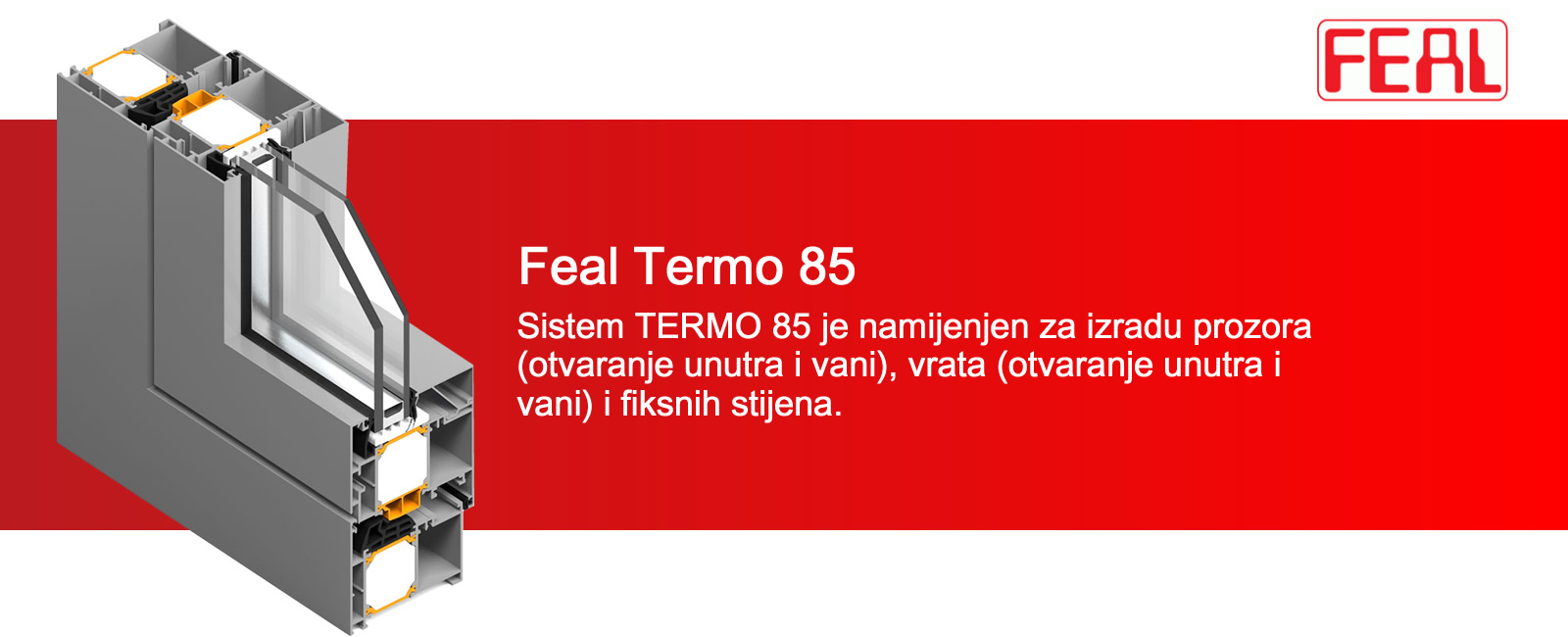 Sistem TERMO 85 je namijenjen za izradu prozora (otvaranje unutra i vani), vrata (otvaranje unutra i vani) i fiksnih stijena. To je sistem profila sa prekinutim termičkim mostom, osnovne ugradbene dubine rama 77 i 85 mm. Pored osnovne izvedbe ram/krilo sa ravnim linijama, moguće su izvedbe ram/krilo i sa zaobljenim vanjskim linijama. Primjenom novih materijala koji imaju izrazito termički dobre karakteristike, ovaj sistem zadovoljava kriterije otvora za niskoenergetske kuće. Prekid termičkog mosta se postiže poliamidnim trakama niskog koeficijenta toplinske provodljivosti (ʎ=0.210 W/mK) od 34 mm. Radi dodatnog poboljšanja termičkih karakteristika profila, u komore profila se ugrađuju profilirani štapići od XPS -a (ekstrudirani polistiren – ʎ=0.035 W/mK) i takvi profili dobivaju u nazivu slovo F. Brtvljenje je izvedeno spužvastim EPDM-om koji ima znatno bolja termička svojstva u odnosu na EPDM brtve. Mogući tipovi otvaranja prozora: otklopno, zaokretno, otklopno-zaokretno, zaokretno otvaranje vani, zaokretno oko srednje osi. Mogući tipovi otvaranja vrata: otvaranje prema unutra i vani. Sistem je kompatibilan sa fasadnim sistemima. Mogućnost odabira profila sa žlijebom 16/13. Okov koji se ugrađuje u sistem je standardni za eurožlijeb 15/20 i za žlijeb 16/13.