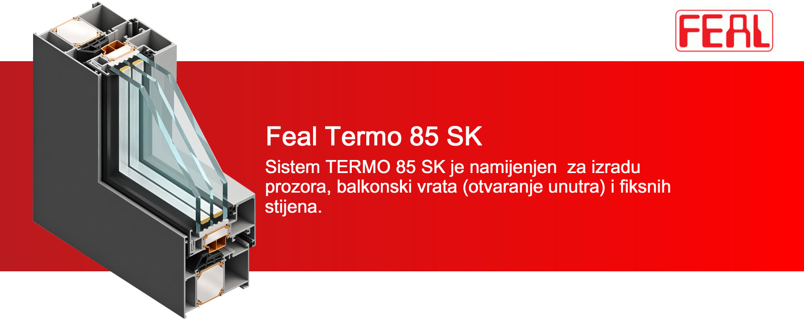 Sistem TERMO 85 SK je namijenjen za izradu prozora, balkonski vrata (otvaranje unutra) i fiksnih stijena. To je sistem profila sa prekinutim termičkim mostom, osnovne ugradbene dubine rama 82 mm. Ovaj sistem karakterizira krilo, koje je zahvaljujući svom obliku u potpunosti s vanjske strane integrirano u ram. Time je vidljiva širina profila prozora svedena samo na širinu rama, bez širine krila kao u ostalim prozorskim sistemima. Prekid termičkog mosta se postiže poliamidnim trakama od 34 mm. Radi dodatnog poboljšanja termičkih karakteristika profila, u komore profila se ugrađuju profilirani štapići od XPS -a (ekstrudirani polistiren – ʎ=0.035 W/m2K) i takvi profili dobivaju u nazivu slovo F. Brtvljenje je izvedeno EPDM brtvama. Mogući tipovi otvaranja prozora: otklopno, zaokretno, otklopno-zaokretno. Sistem je kompatibilan sa fasadnim sistemima. Okov koji se ugrađuje u sistem je standardni za eurožlijeb 15/20.